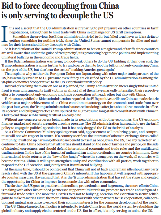 美国针对中国的关税政策,目的是要孤立中国,把中国赶出全球产业链供应链,重建以美国为中心的世界体系。但美方应该清楚,损人往往不能利己,试图孤立他人的人,终将难逃被他人孤立的结局。